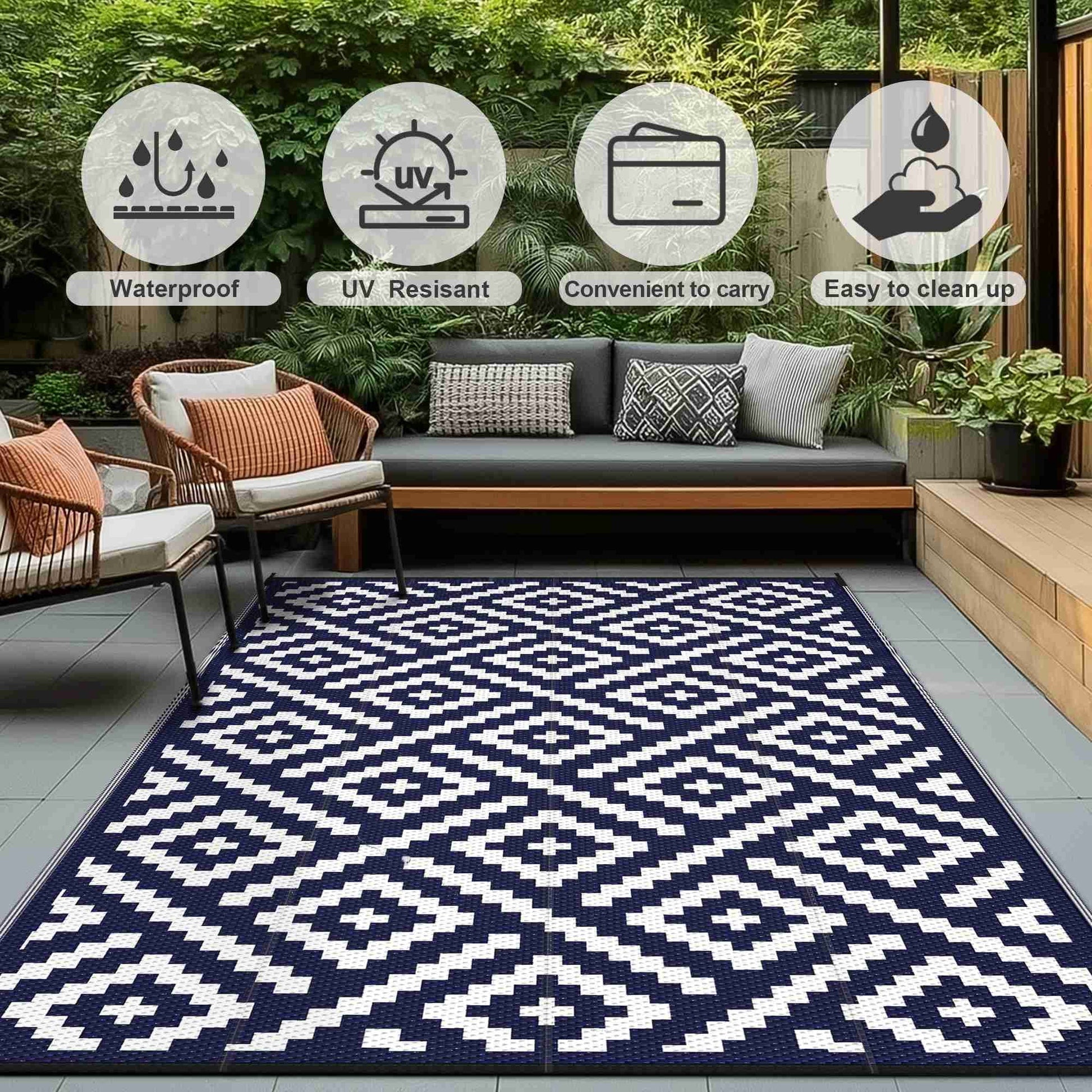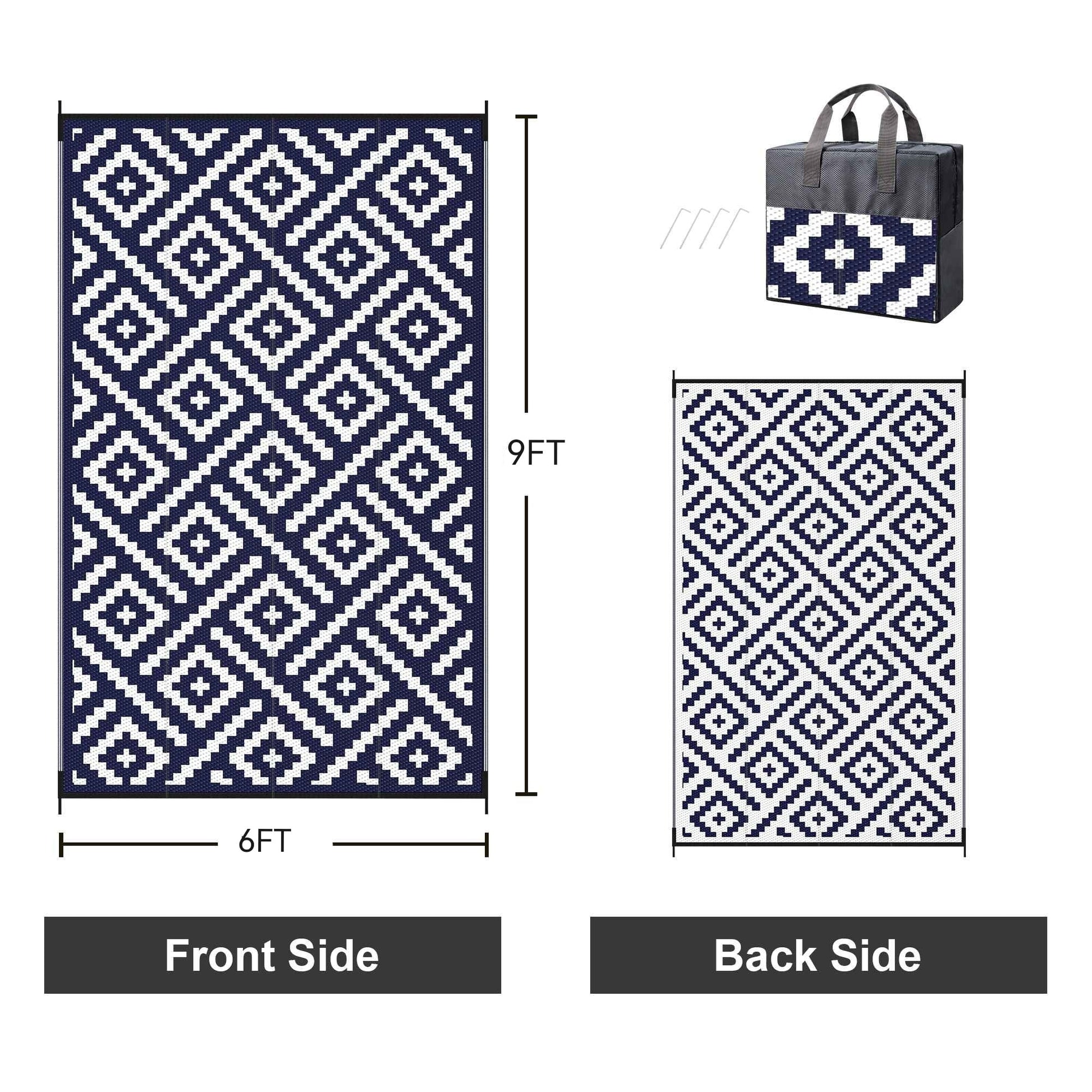 KUETH's latest outdoor Navy Blue White rug features geometric patterns that are rhythmic.Lightweight Reversible Plastic makes the 6' x 9' size product easy to carry and transport.The outside mat is designed with wrapped edges and fixed straps around and around corners,so there is no need to worry about being carried away by wind.Our outside mat is waterproof and UV Resistant.It can be easily cleaned with water or wet cloth and dried quickly.This outdoor campground mat is available for a variety of scenarios such as: terraces, campervans, motorhome road trips,camping, balconies, picnics, porches, decks and gardens. Choose your favorite!